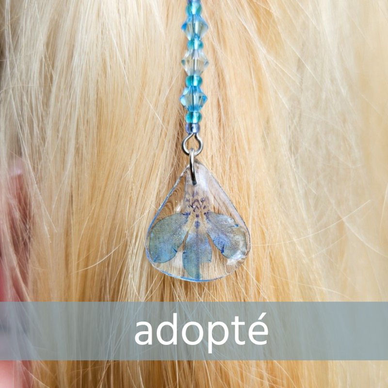 Chaine de cheveux Naïade, elle se compose de fleur de lobélia que je glace avec la même technique que mes bijoux végétaux. Elles sont monté sur des chaines en acier inoxydable avec des perles de crystal et de verres dans la même harmonie colorée.