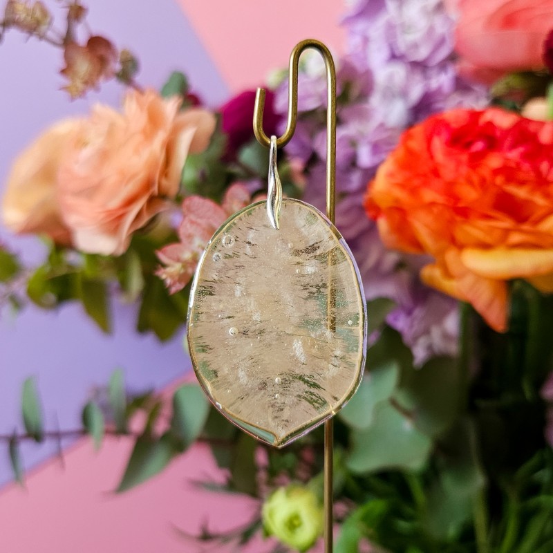Ce pendentif délicat est réalisé à partir de la membrane de lunaires (monnaie du pape) soigneusement préservé dans de la résine. Chaque pièce est sculptée à la main pour suivre la forme naturelle de la plante, deux oxydes de zirconium y sont incrustés (1,5mm et 2mm) puis montée sur un support en argent 925.