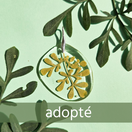 Ce pendentif délicat est réalisé à partir de feuilles de rue officinale soigneusement préservé dans de la résine. Chaque pièce est sculpté à la main pour suivre la forme naturelle de la plante puis monté sur un support en argent 925.
