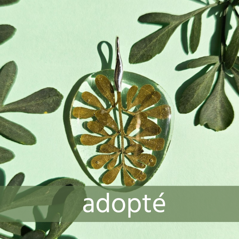 Ce pendentif délicat est réalisé à partir de feuilles de rue officinale soigneusement préservé dans de la résine. Chaque pièce est sculpté à la main pour suivre la forme naturelle de la plante puis monté sur un support en argent 925.