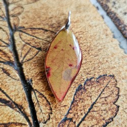 Pendentif myrtiller d'automne, réalisé avec une feuille de myrtiller récolté à l'automne et incluse dans plusieurs couches de résine, retravaillées à la forme de la feuille et monté sur de l'argent 925.
