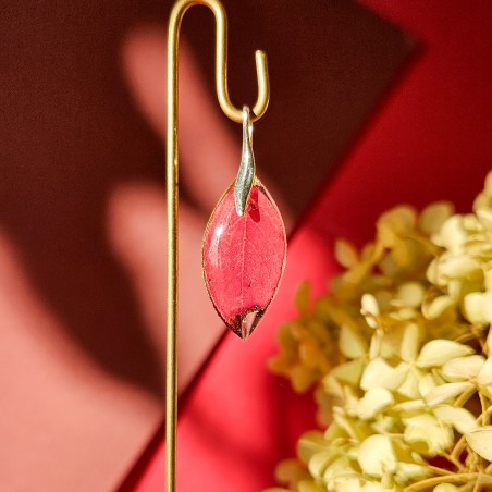Bijoux végétaux réalisés à partir de feuilles, pétales et fleurs que je fais sécher sous presse pour retirer l'humidité de la plante. Puis je les recouvre de plusieurs fines couches de résine que je sculpte à la forme du végétal. Je les monte ensuite sur des montures en argent, c'est un métal anti-bactérien, réparable et recyclable.