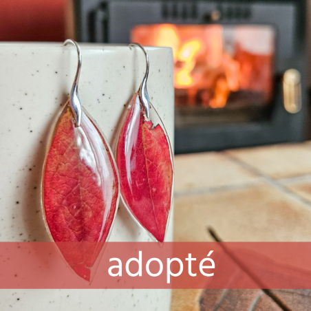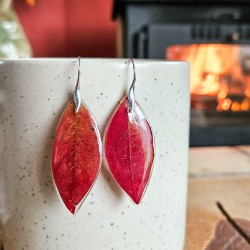 Boucles d'oreilles myrtiller d'automne, réalisées avec des feuilles de myrtiller récolté à l'automne, incluse dans plusieurs couches de résine, retravaillées à la forme des feuilles et montés sur de l'argent 925.