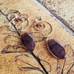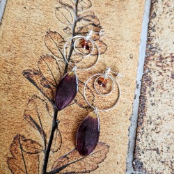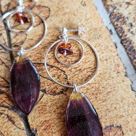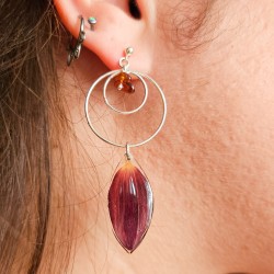 Ces boucles d'oreilles délicates sont réalisées à partir pétales de tournesols soigneusement préservé dans de la résine. Chaque pièce est sculptée à la main pour suivre la forme naturelle de la plante puis montée sur un support en argent 925 avec des petites pierres de grenats orange.