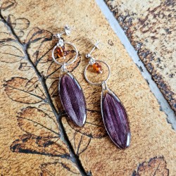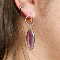 Ces boucles d'oreilles délicates sont réalisées à partir pétales de tournesols soigneusement préservé dans de la résine. Chaque pièce est sculptée à la main pour suivre la forme naturelle de la plante puis montée sur un support en argent 925 avec de petites pierres de grenat orange.
