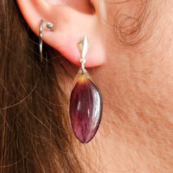 Ces boucles d'oreilles délicates sont réalisées à partir pétales de tournesols soigneusement préservé dans de la résine. Chaque pièce est sculptée à la main pour suivre la forme naturelle de la plante puis montée sur un support en argent 925.